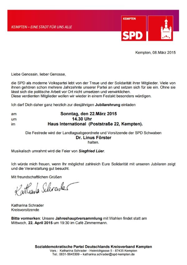 Einladung Jubilarehrung 2015 SPD Kempten